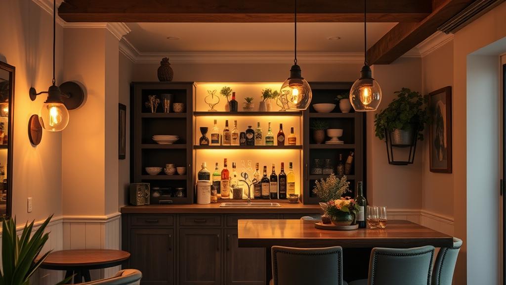 - Luci decorative e indirette: Le strisce LED a luce calda sono un alleato prezioso. Puoi posizionarle sotto pensili, all’interno di una nicchia o dietro lo specchio del bar per creare un affascinante effetto “glow” che fa risaltare le bottiglie. Anche una lampada da tavolo con un paralume in tessuto contribuisce a creare un cono di luce intimo e confortevole.
