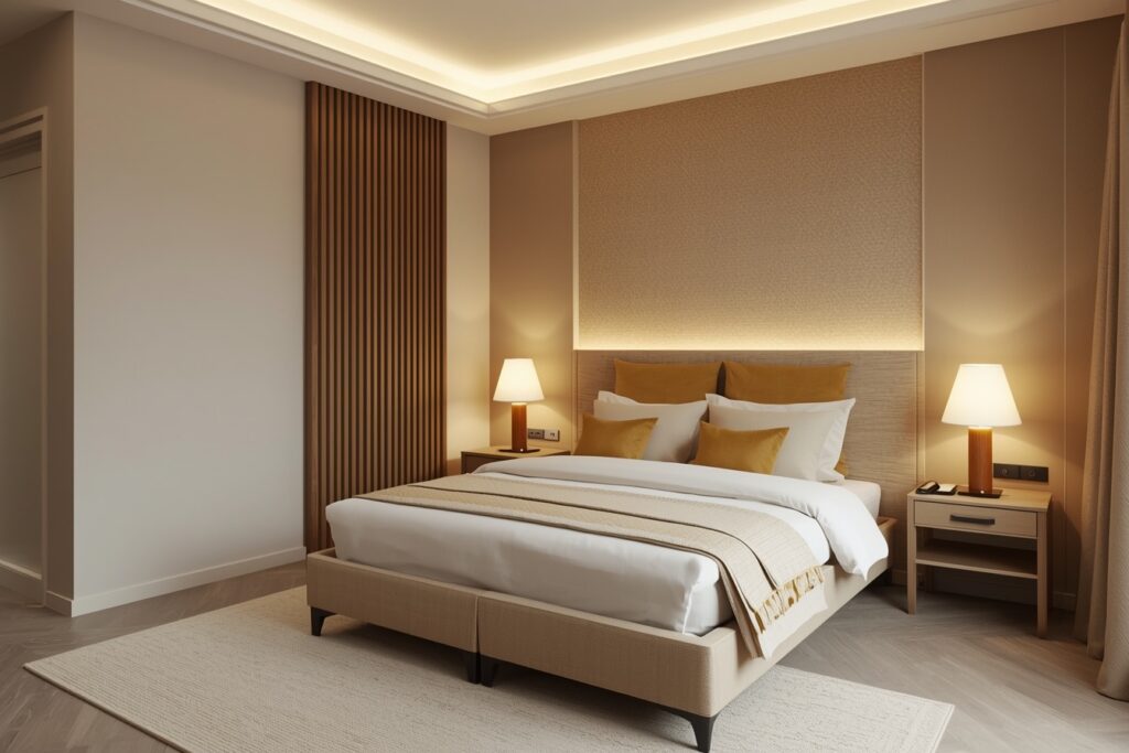 - Tessuti ricchi: come velluto o seta per le tende e il copriletto, che enfatizzano la sensazione di lusso.