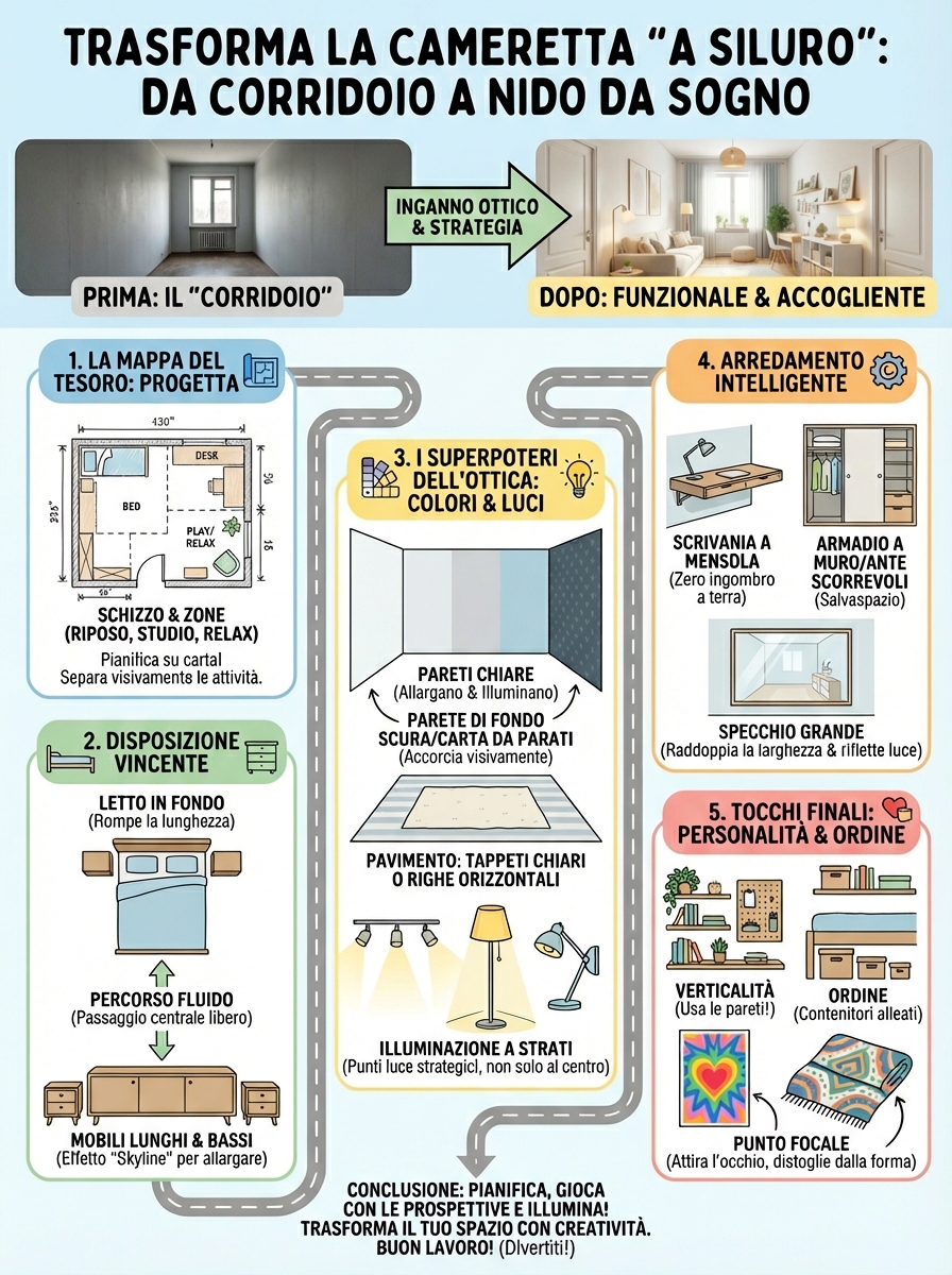 Niente panico! Le camerette “a siluro” sono una sfida comune, ma con i giusti trucchi, possono trasformarsi in ambienti funzionali, super-stilosi e incredibilmente accoglienti. La parola d’ordine è inganno ottico: useremo l’arredamento per “allargare” e “accorciare” visivamente la stanza.